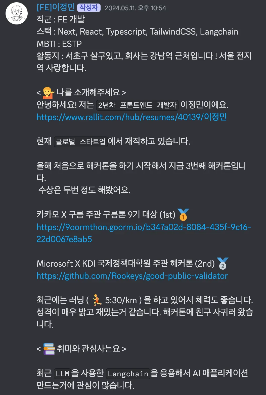 디스코드에 초대가 되서 각자 자기소개 채널에서 본인 PR을 올리는게 1단계였구요.
