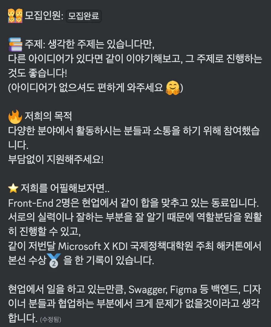 일단 저와 동료는 팀원 모집글을 작성하였습니다.